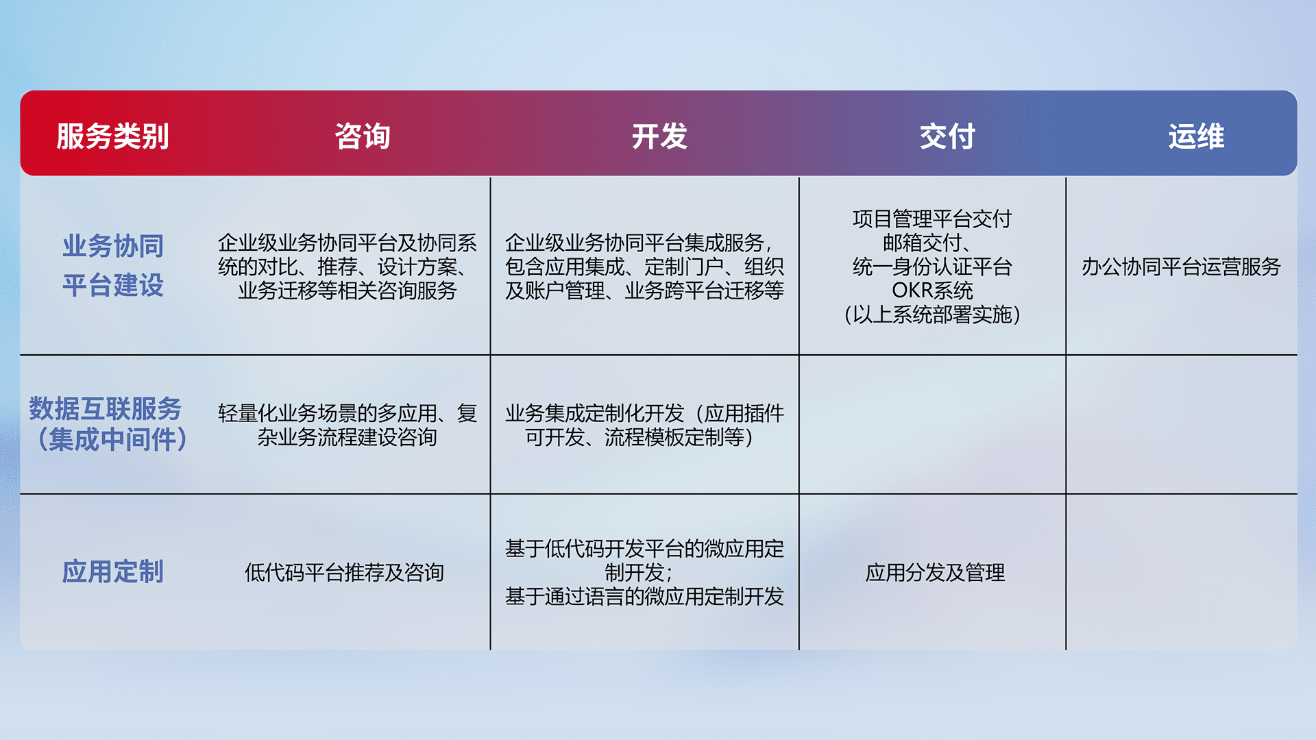 针对钉钉、、、企微、、、IDaas等平台级产品提供产品的规划、、、方案、、、、交付、、、定制化开发等服务,,,实现如统一协同办公、、智能客户服务、、、、混合会议管理、、智能数据查询、、、、等业务场景,,实现数字化转型。。